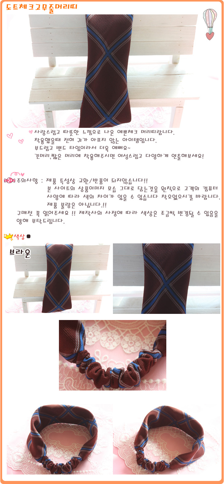 색상 도트체크고무줄머리띠(브라운)