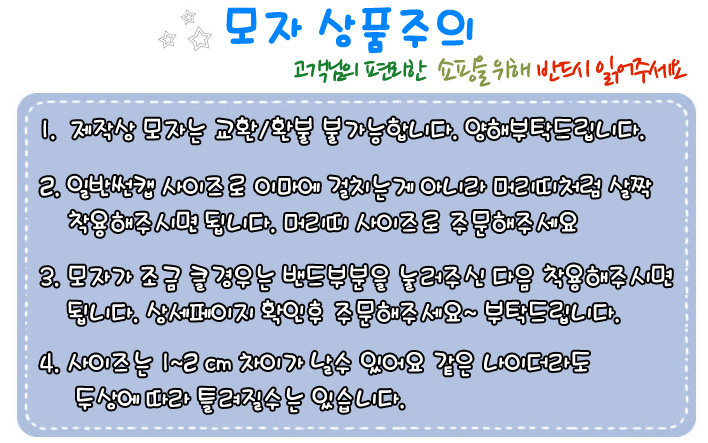 ★회원가입후 적립금 1,000원을 드립니다.★3만원 이상 무료배송~★제작상 교환/반품 불가능하니 주문전 확인바랍니다.★같은 나이더라도 두상에 따라 틀려질수는 있습니다.★지키지 않을시에는 민형사상의 책임지지않음