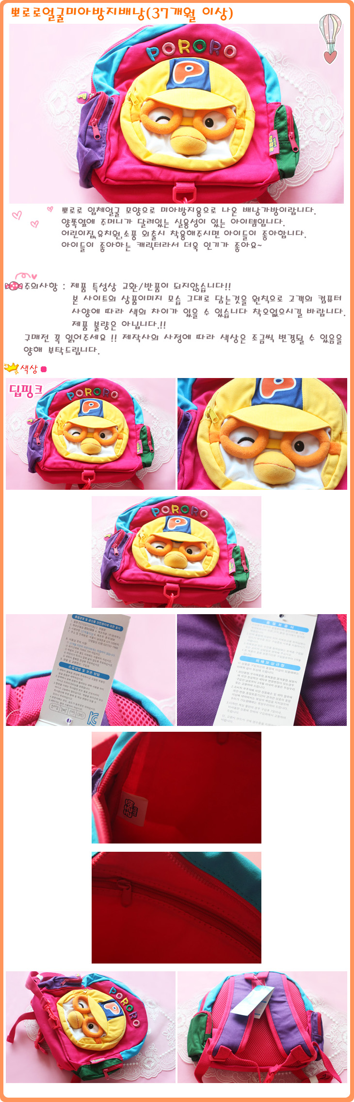 색상 뽀로로얼굴미아방지배낭(딥핑크)